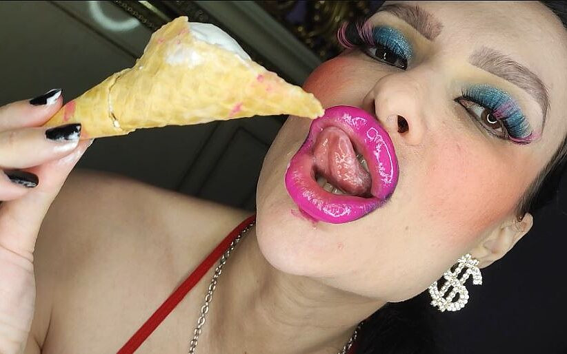 I am perfect bimbo. I'm wearing a super slutty outfit, extremely high heels. I have super bright makeup. My lips are covered by shiny glossy pink lipstick and black lip liner. I seductively and slowly eat ice cream so you can watch every movement of my huge filled lips! Very sexy video. A paradise for lovers of lipstick fetish and lip fetish.