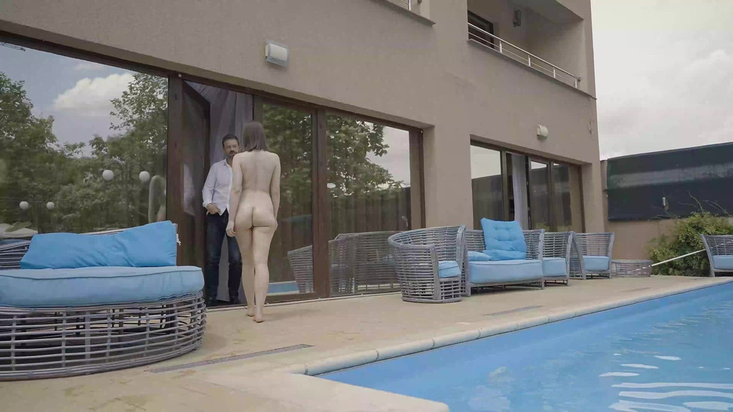 young and horny lies by the pool and gets horny and goes in to be fucked, big tits beautiful body, blowjob, licking, big cock, jerking off, from behind, riding, cumming on her big horny tits.